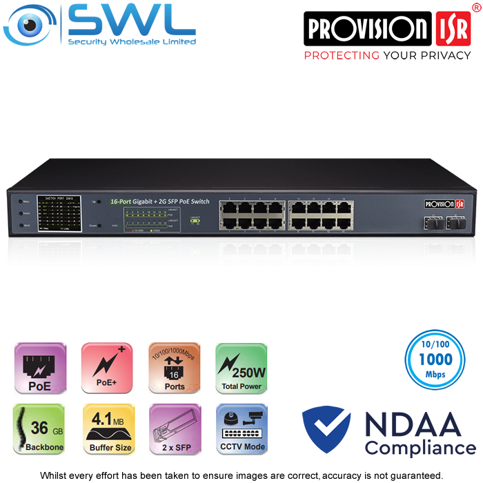 - Provision-ISR PoES-16250GCL+2SFP: 16x Giga PoE Switch + 2x SFP 250W, CCTV Mode