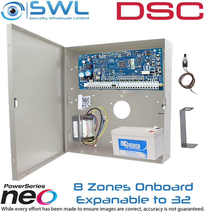 - DSC Neo Kit: 8-32 Zone Panel, Battery, Cabinet, Transformer, Tamper - No Keypad