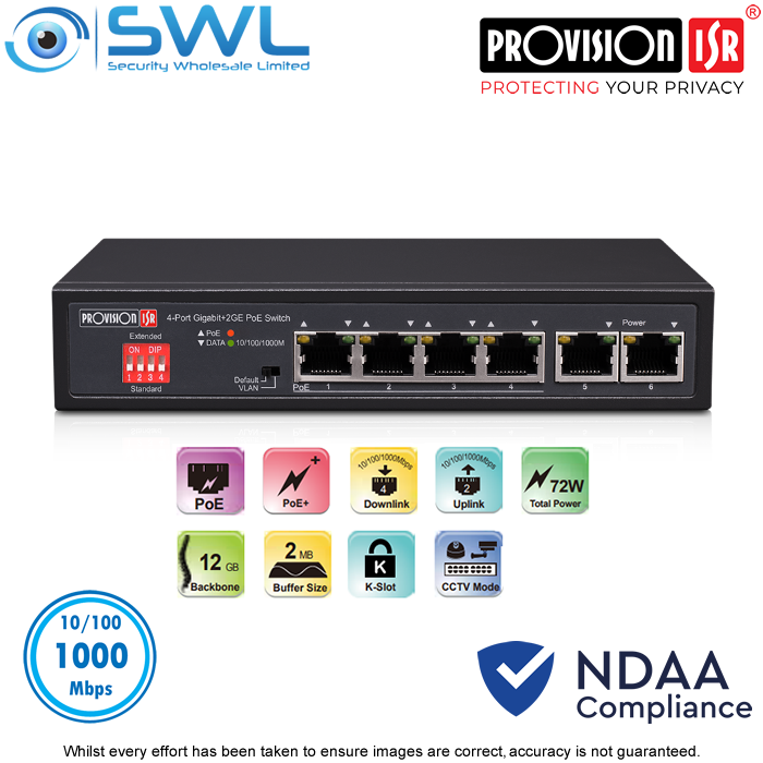 - Provision-ISR PoES-0472GC+2G: 4 x Gigabit PoE + 2 x Link 72W