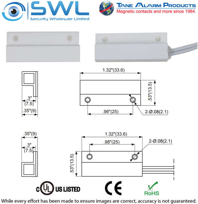 * Contact Size: 33.6 (L) ×13.5 (W) ×7.5 (H) (1.32" × .53"× .3")* Standard Magnet Size: 33.6 (L) × 13.5 (W) × 7.5 (H) (1.32" × .53"× .3")