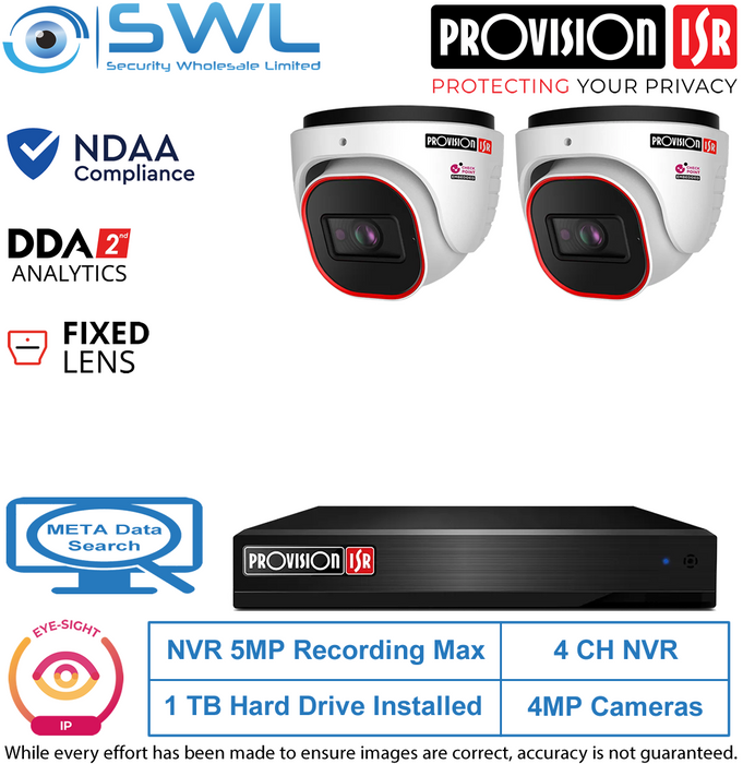 1 x Provision-ISR NVR5-4100PXN(MM) 4CH NVR 335042 x Provision-ISR DI-340IPEN-28-V4 Eye-Sight: 4MP NDAA Turrets 33152