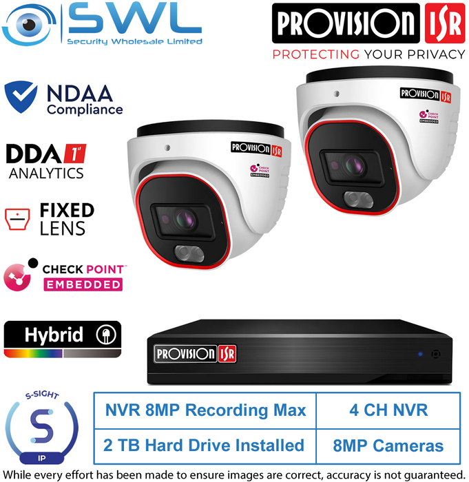 1 x Provision-ISR NVR8-4100PN-V2: 4CH 8MP NVR 335062 x Provision-ISRDH-380IPSN-28 S-Sight: 8MP NDAA Turrets 33029