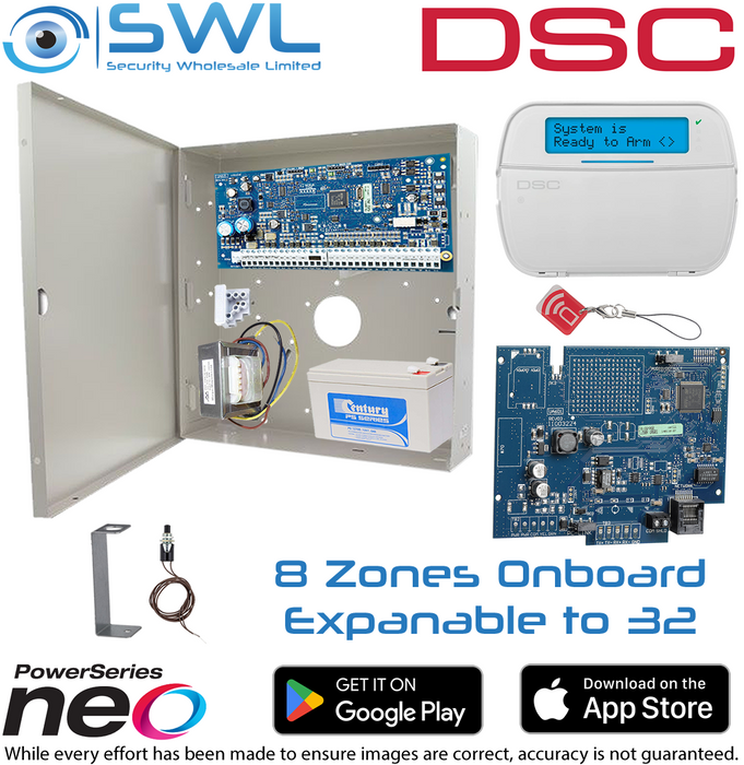 - DSC Neo Kit: 8-32 Zone, Cabinet, Transformer, Tamper, LCD KP Prox, Com Module