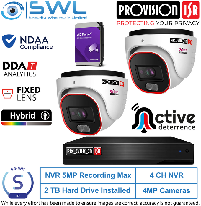 1 x Provision-ISR NVR5-4100PXN(MM) 4CH NVR 335042 x Provision-ISR DH-340ADSN-28 S-Sight: 4MP Active Deterrent Turret Hybrid 33016