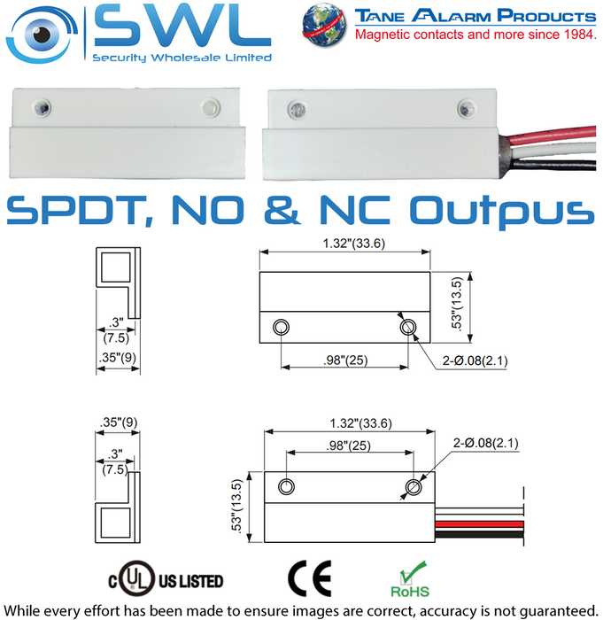 - TANE FM-104C Surface Reed: 33.6x 13x 7.5mm. 21mm Gap. SPDT, NO/NC,Side Lead Type