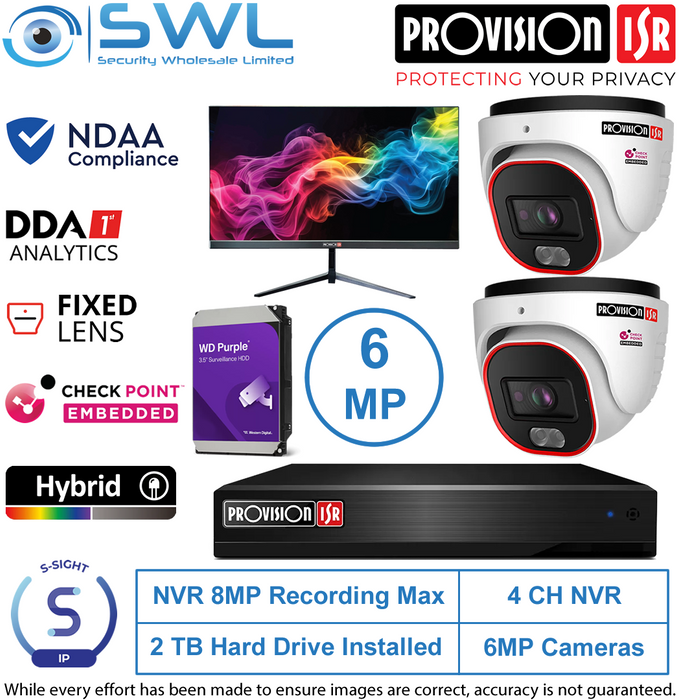 Provision-ISR 4CH NVR8 KIT: 2x 6MP S-Sight Turrets 2.8mm 2Tb HDD, 24" Monitor