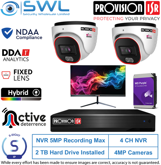 1 x Provision-ISR NVR5-4100PXN(MM) 4CH NVR 335042 x Provision-ISR DH-340ADSN-28 S-Sight: 4MP Active Deterrent Turret Hybrid 330162