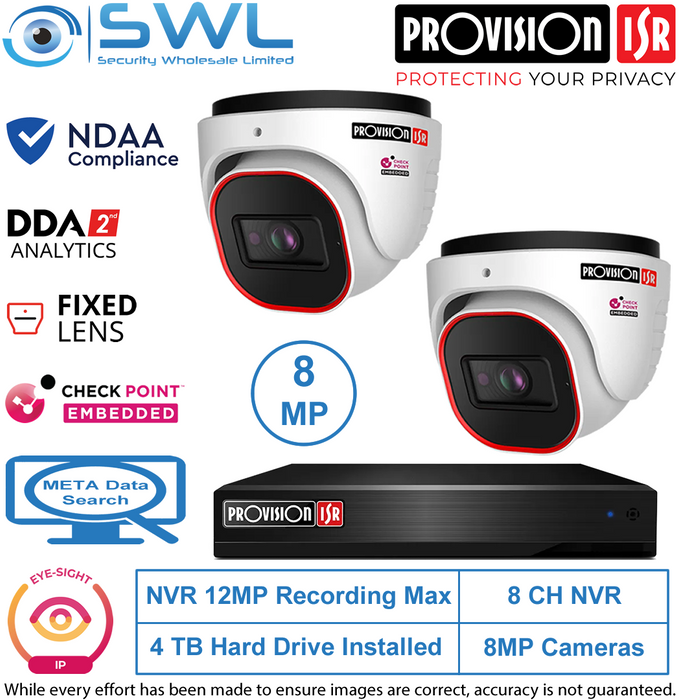 1 x Provision-ISR NVR12-8200PFAN 8CH NVR 335562 x Provision-ISR DI-380IPEN-MVF-V5: Eye-Sight 8MP Turret NDAA 33170