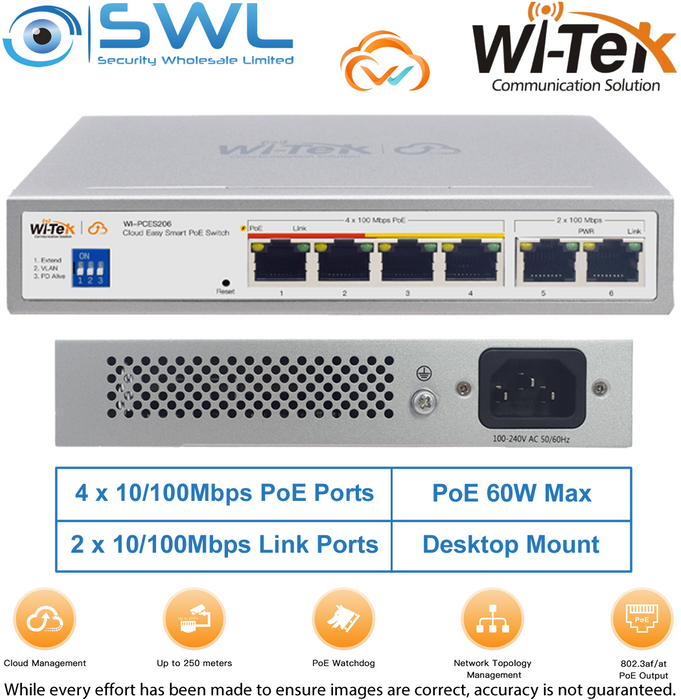 Wi-Tek WI-PCES206: 4x 100Mbps PoE Ports + 2x 100Mbps RJ45, 60W, Cloud