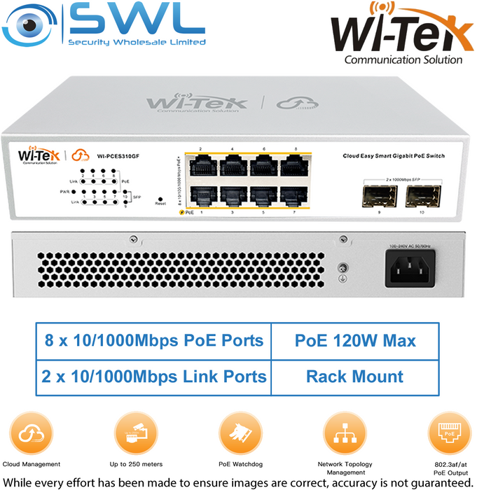 - Wi-Tek WI-PCES310GF V2: 8x 1000Mbps PoE Ports + 2x 1000Mbps SFP, 120W, Cloud